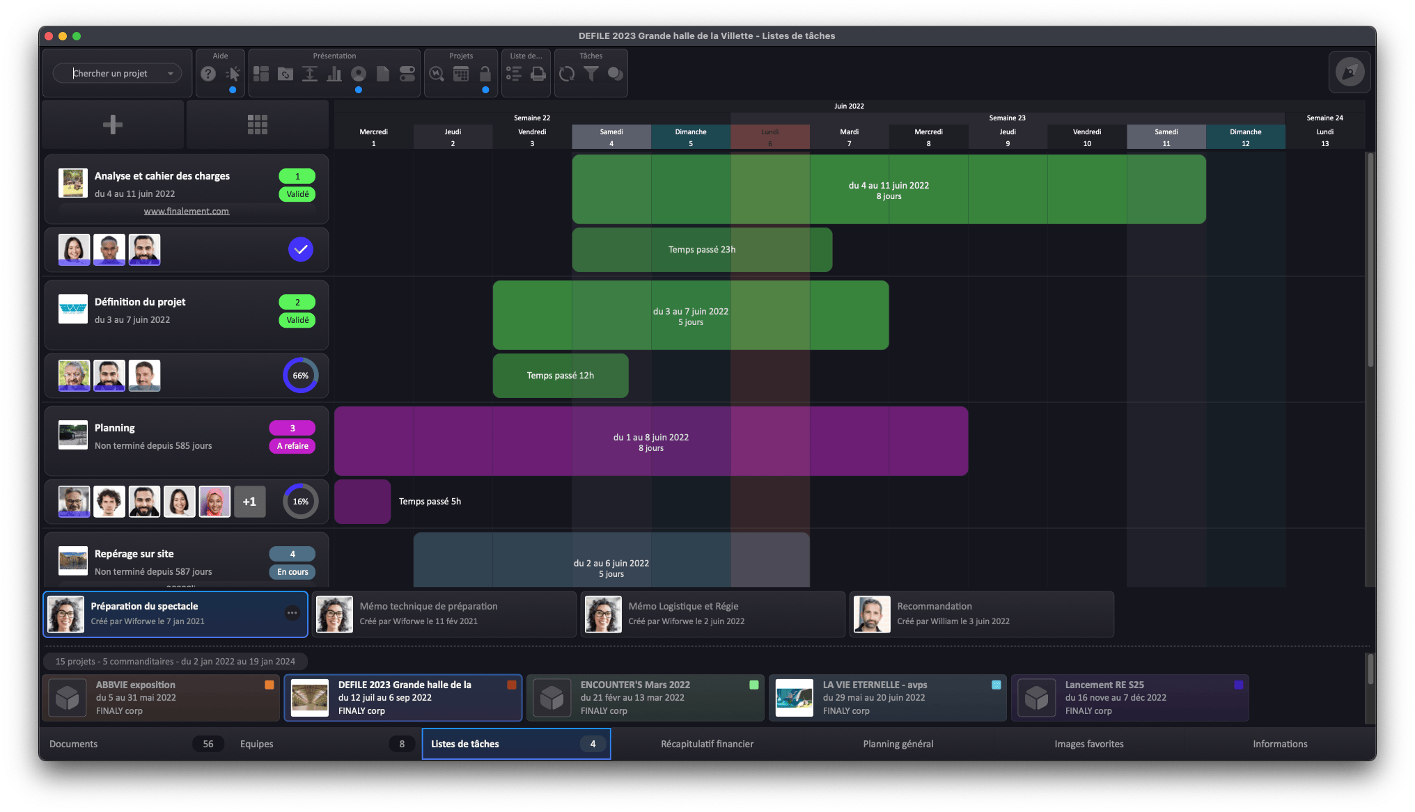planning général • plannings de production • révervations personnels et équipements • tâches de travail